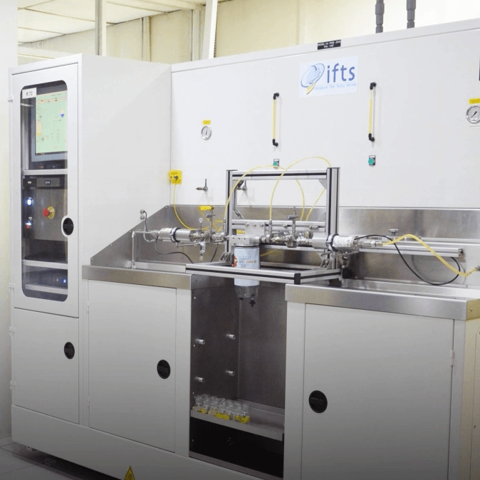 Micron-sized liquid particles are filtered through all products. This test is used to identify any leakage or drain-back issues.